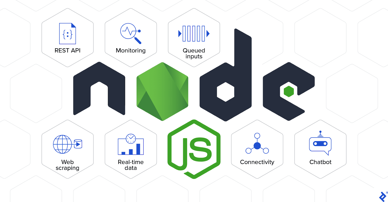 Alt text: The Node.js logo surrounded by icons, which are labeled REST API, Monitoring, Queued inputs, Web scraping, Real-time data, Connectivity, and ChatBot.