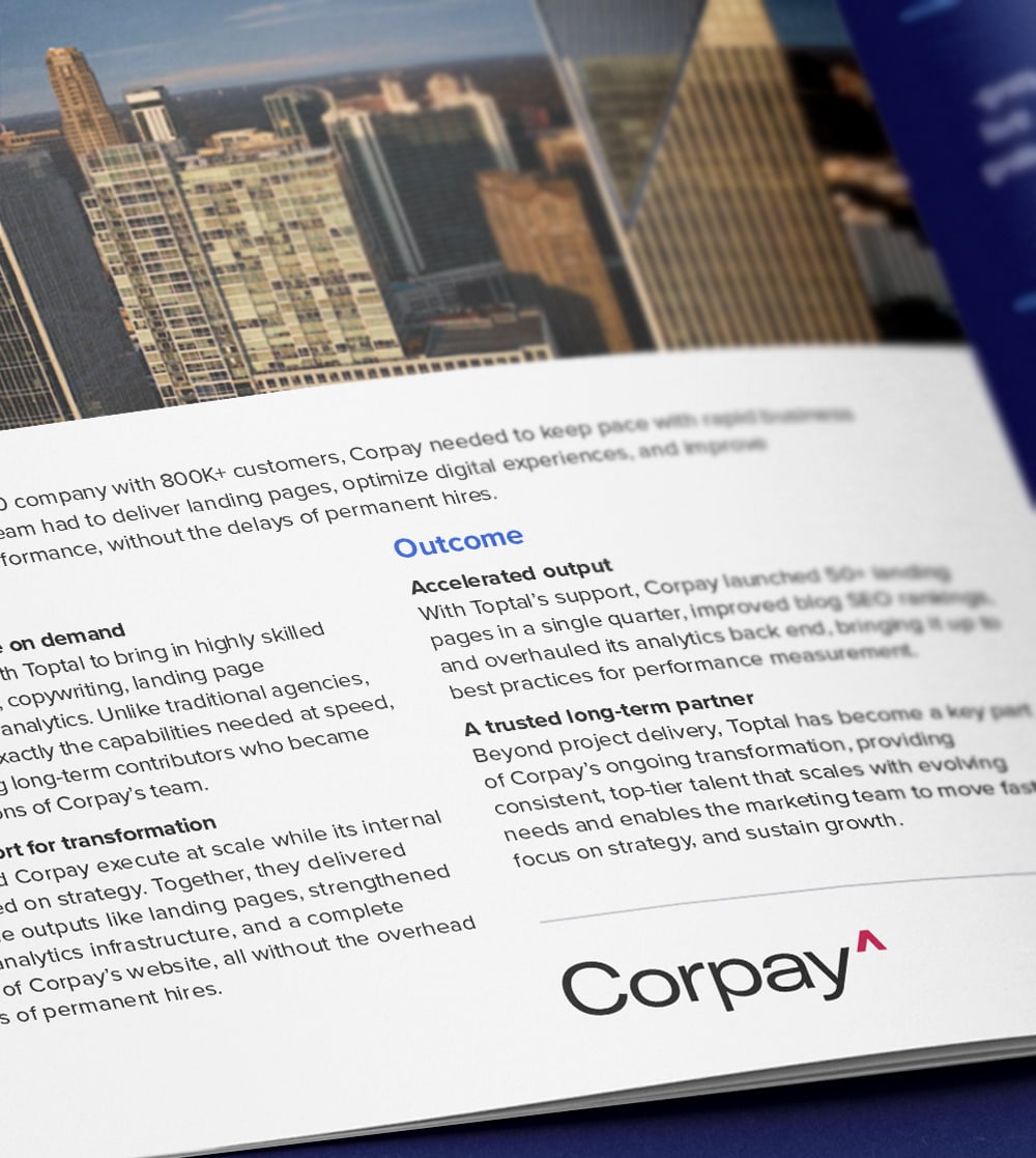 With Toptal’s support, Corpay launched 50+ landing pages in a single quarter, improved blog SEO rankings, and overhauled its analytics back end to meet best practices for performance measurement. Beyond project delivery, Toptal has become a key part of Corpay’s ongoing transformation, providing consistent, top-tier talent that scales with evolving needs and enabling the marketing team to move faster, focus on strategy, and sustain growth.